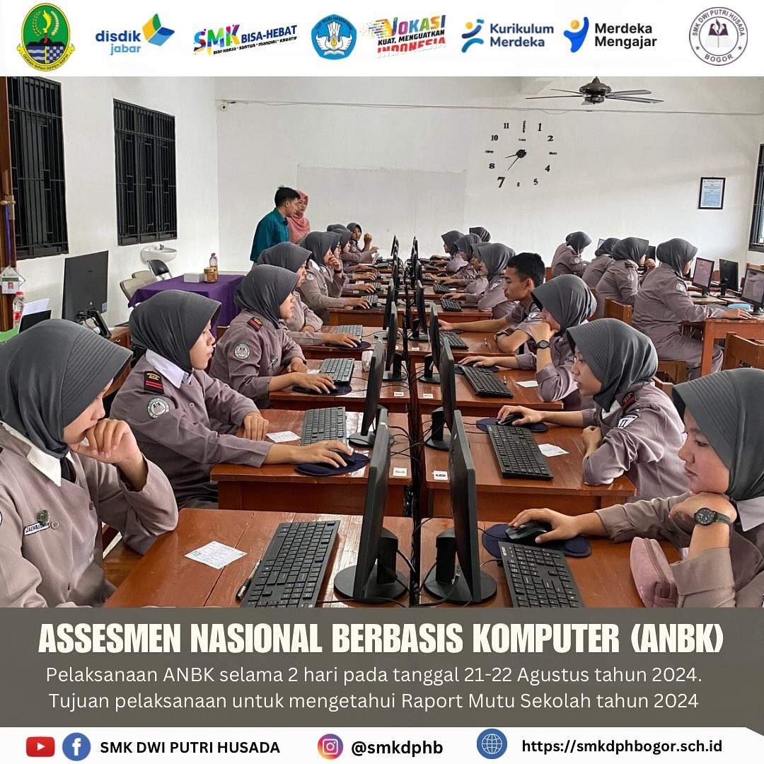 Kegiatan ANBK (Assesmen Nasional Berbasis Komputer) SMK Dwi Putri Husada dilaksanakan 2 Hari dimulai dari tanggal 21-22 Agustus 2024, peserta ANBK sebanyak 45 siswa kelas 11 Keperawatan & Farmasi, Kegiatan ANBK dilaksanakan dengan pengawas silang antar sekolah di kota bogor. Pelaksanaan ANBK bertujuan untuk mengetahui raport mutu sekolah tahun 2024.