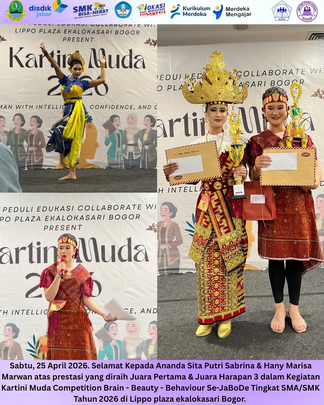 Sabtu, 25 April 2026. Selamat Kepada Ananda Sita Putri Sabrina & Hany Marisa Marwan atas prestasi yang diraih Juara Pertama & Juara Harapan 3 dalam Kegiatan Kartini Muda Competition Brain - Beauty - Behaviour Se-JaBoDe Tingkat SMA/SMK Tahun 2026 di Lippo plaza ekalokasari Bogor.